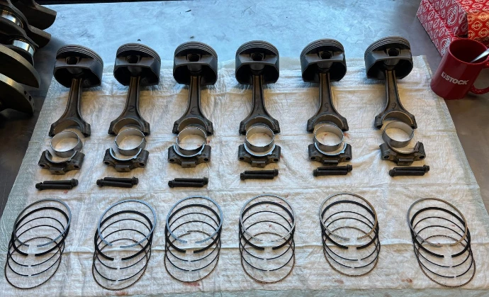 Das Bild zeigt Kolben, Pleuelstangen, Kolbenringe und Pleuellager – zentrale Bauteile eines Motors, die Bewegung und Kraftübertragung ermöglichen.